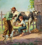 Ensuite, il fallait s’asseoir sur un petit banc tout près de la vache pour extraire son lait par les trayons et faire tomber le lait dans une chaudière. Moi j’essayais, mais je trouvais cela très difficile. La vache m’envoyait la queue dans la face. Elle essayait bien sûr d’écarter les mouches, mais elle devait trouver aussi que je n’étais pas très habile comparativement à mes cousins qui faisaient cela régulièrement.